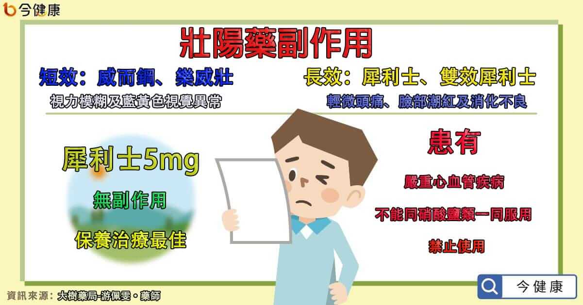 勃起功能障礙的壯陽藥物代謝主要在肝臟進行,高脂肪食物可能會延遲威而鋼與樂威壯的吸收,犀利士則不會受食物影響。PDE5抑制劑常見的副作用有頭痛、臉部潮紅及消化不良,除此之外,需提醒病人使用威而鋼與樂威壯藥物期間,注意有無出現視力模糊及藍黃色視覺異常徵兆;犀利士會影響肌肉上的第十一型磷酸二酯酶(PDE11),可能會引起背痛及肌肉疼痛的副作用。使用這類藥物有嚴重心血管疾病或病史者則不建議使用,此外若與甲型交感神經阻斷劑併用(如:Doxaben,可迅),需注意低血壓副作用;若與含有硝酸鹽類成分的血管擴張劑併用(如Isobide,易適倍、Ibimo,愛彼脈、Silvinol,喜必諾、Nitrostat,耐絞寧等),可能會造成嚴重血壓下降而危及生命,因此服用威而鋼與樂威壯與含有硝酸鹽類成分最少要間隔24小時,而犀利士由於作用時間較長,必須間隔4-5天。去年美國食品衛生管理局核准了第四種PDE5抑制劑Avanafil(Steudra),建議於性行為前30分鐘服用,但目前台灣尚未核准上市。