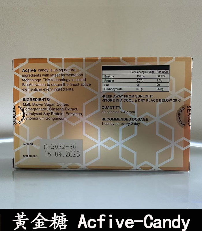 汗馬糖 Acfive-Candy 黃金糖 由馬來西亞原廠精心研製最新精力糖,承襲品牌二十多年精力保健的配方精髓,並全面升級成 第七代最新版本