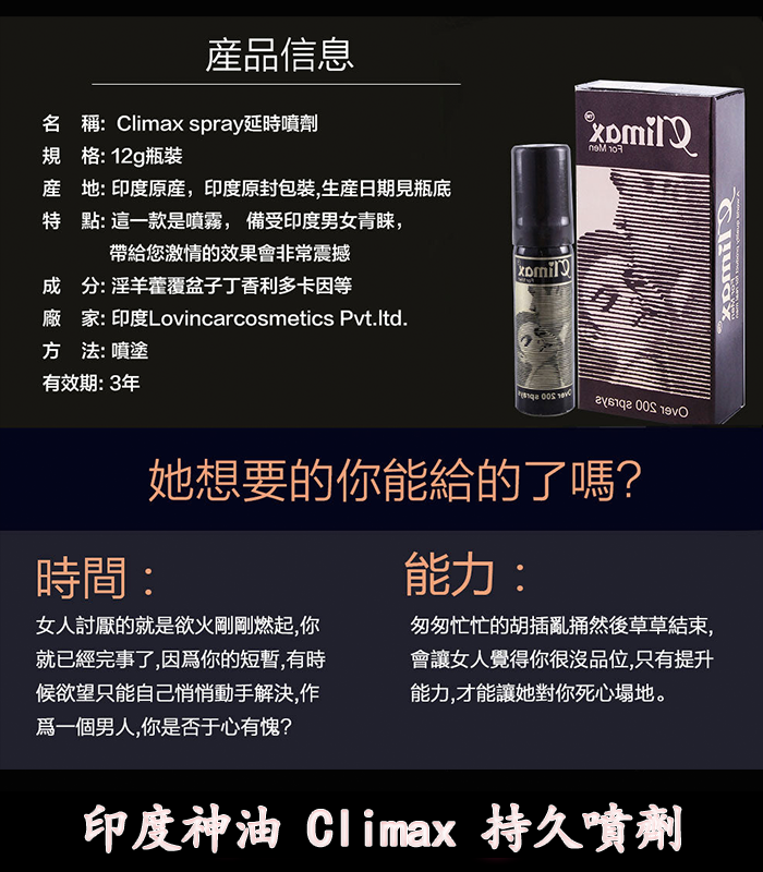 搶先評價 “印度神油 Climax|經典延時噴劑|強效控時、提升快感”