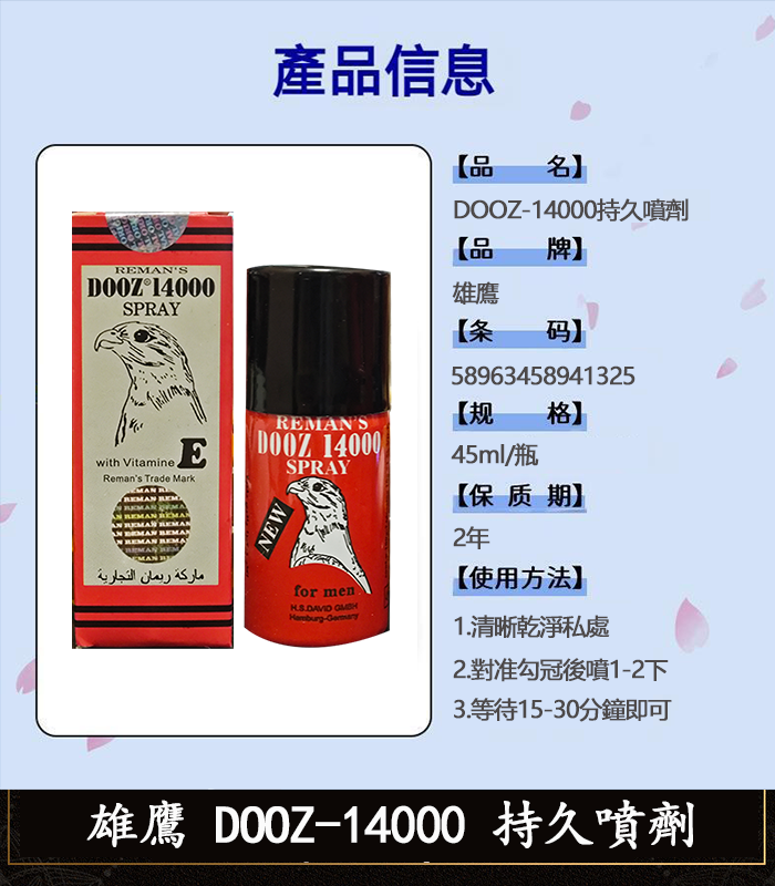 | 中文名 | 雄鷹DOOZ-14000持久液 | 健保局衛生許可證號 | (3251)第1688號 | ||