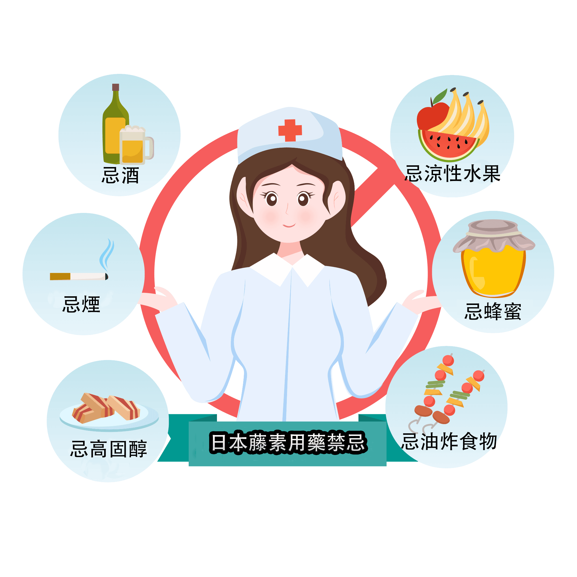 有些食物或酒水可能會和日本藤素發生交互作用,影響它的吸收和效果。醫生可能會提醒你們避免或限製攝入某些特定的食物,比如辛辣,油炸類的。在服用藤素1小時前,切忌飲酒。請仔細瞭解醫生的飲食建議,並且按照相應的指示去做。
